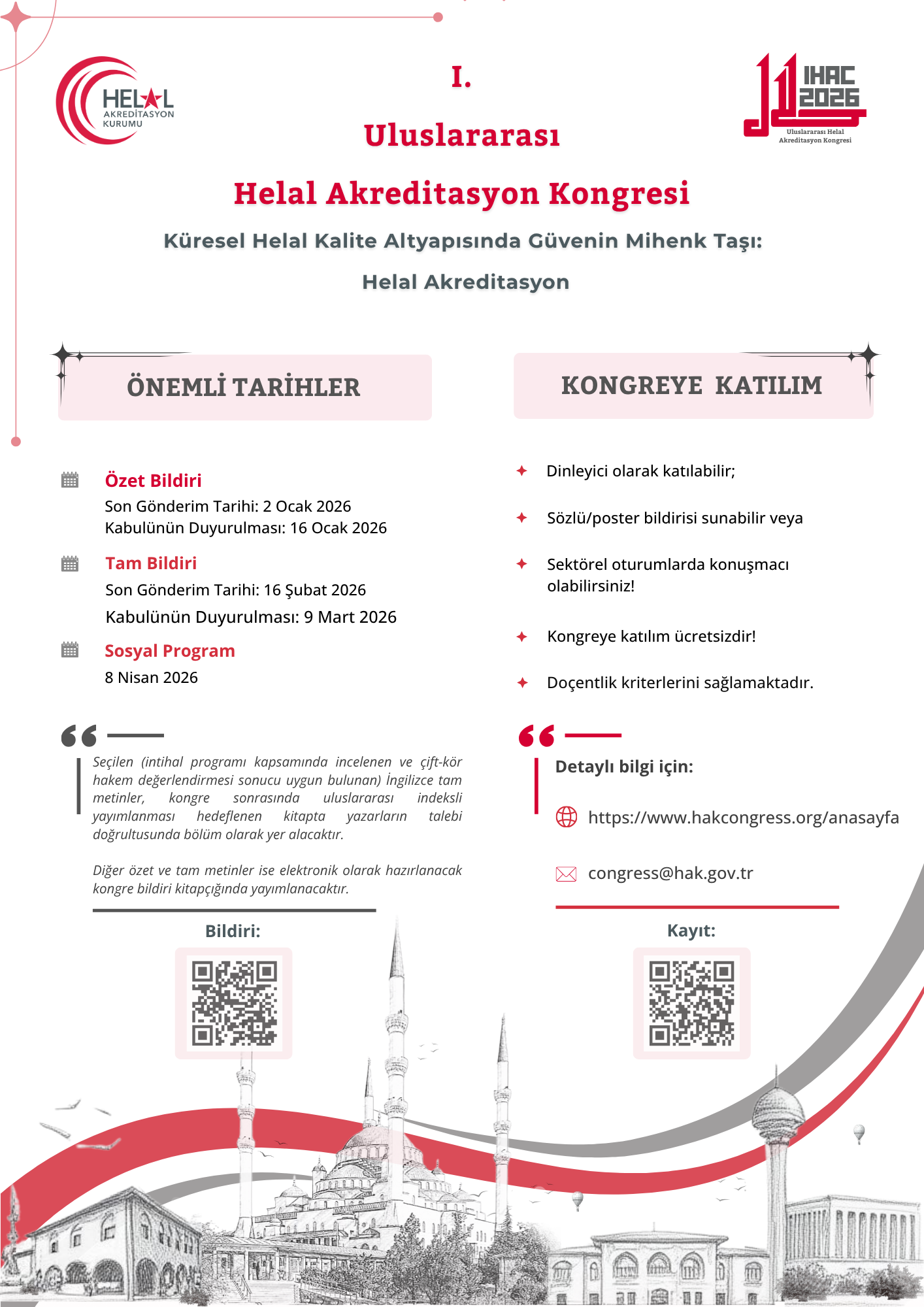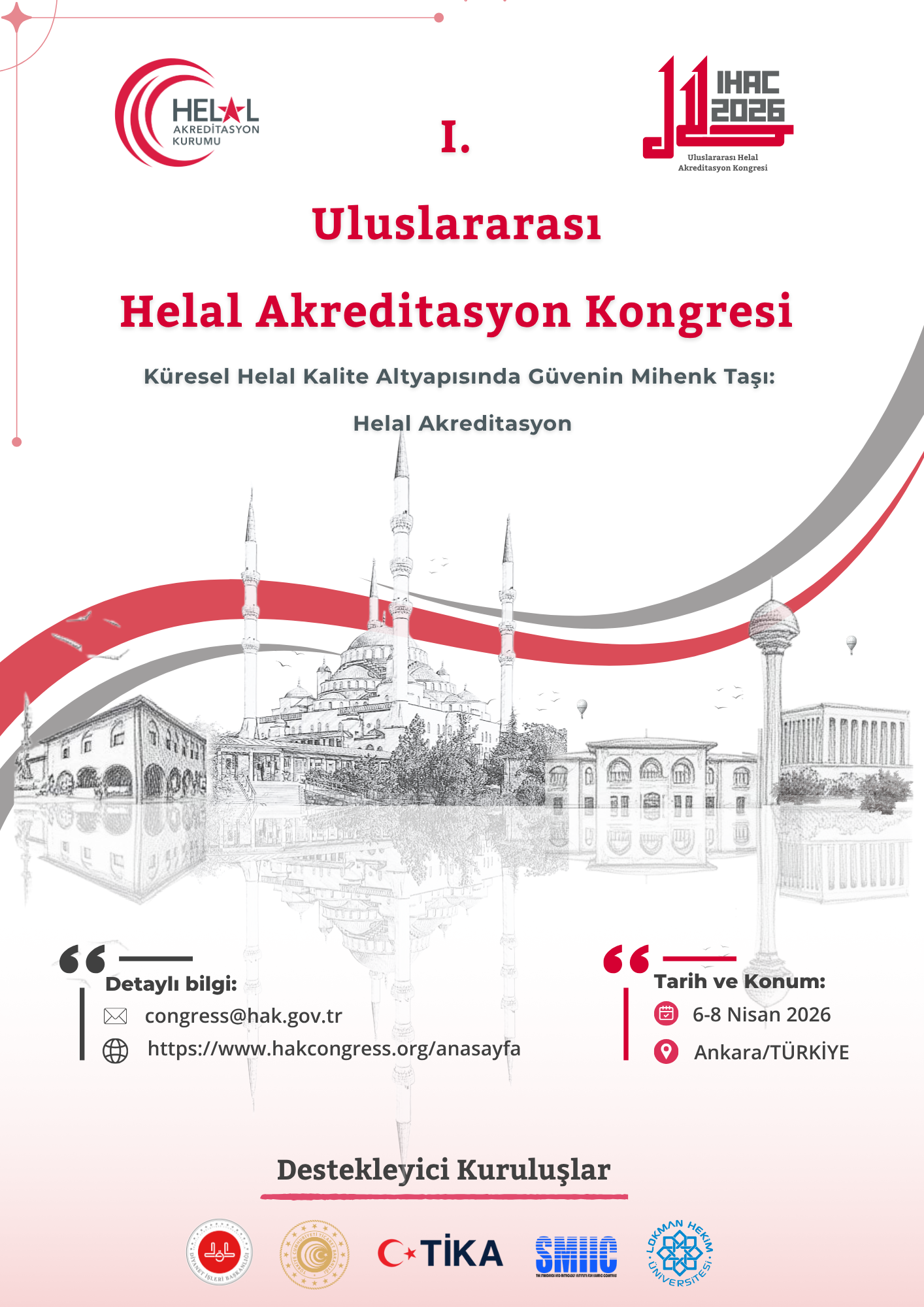 Türkiye’nin kalite altyapısı alanındaki birikimini helal uygunluk değerlendirme alanına aktarmak ve helal sektöründe öncü bir rol üstlenmek amacıyla yola çıkan T.C. Helal Akreditasyon Kurumu (HAK) adına, sizleri 6-8 Nisan 2026 tarihleri arasında Ankara’da düzenlenecek olan I. Uluslararası Helal Akreditasyon Kongresi - Küresel Helal Kalite Altyapısında Güvenin Mihenk Taşı: Helal Akreditasyon’a davet etmekten büyük mutluluk duymaktayız.