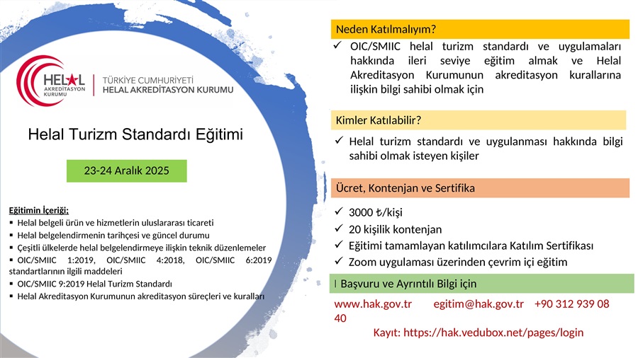 Helal Turizm Standardı Eğitimi, 23-24 Aralık 2025 tarihlerinde çevrim içi (online) olarak gerçekleştirilecektir.
